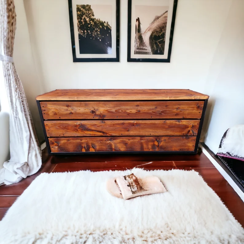 Masif ahşaptan yapılmış çekmeceli dolap 3 çekmecelidir ve standart olarak kabuk kulpları vardır